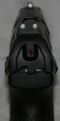 The trigger feels heavy at first but that is the double action first shot, in single action the trigger is very crisp with a long travel before the break. This travel is less apparent when shooting quickly and I was able to achieve sub 0.2 second split times between shots consistently. The sights are easy to pick up with white dots on all three which makes for very quick aiming; the rear sight is adjustable left and right.